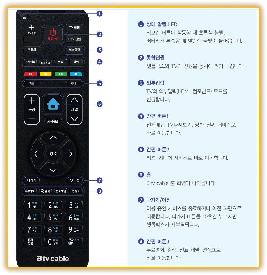 – B tv 셋톱박스는 업데이트가 잦아, 재부팅만으로도 일시 오류가 해결되는 경우가 많습니다.