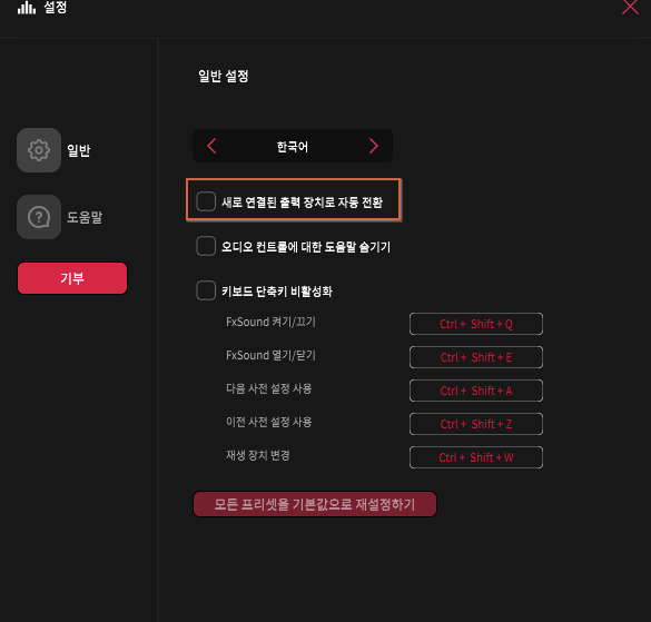 - PC를 새로 시작하거나 중간에 선택한 장치가 바뀌는 경우가 발생합니다. 그럴때는 설정에서 새로 연결된 출력장치로 자동전환 옵션을 해제해 주시면 됩니다.