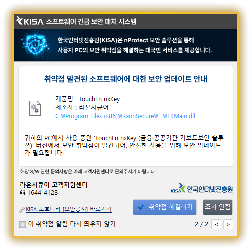 구버전이 설치된 PC는 공격 표적이 될 수 있으므로, KISA는 nProtect 백신과 연동한 ‘소프트웨어 긴급 보안 패치 시스템’을 통해 팝업(클리닝 서비스 안내 창)을 띄워 업데이트를 독려하고 있습니다.