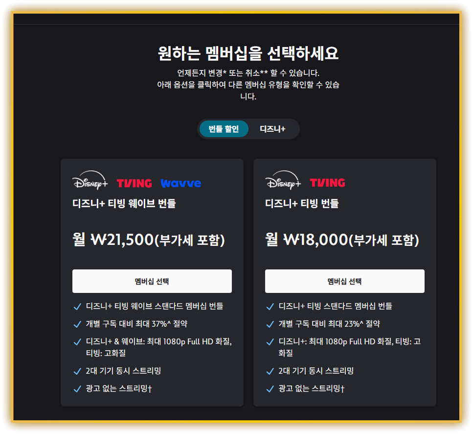 • 무광고 / 1080p FHD(디즈니+·웨이브) / 고화질(티빙) / 동시 시청 2대